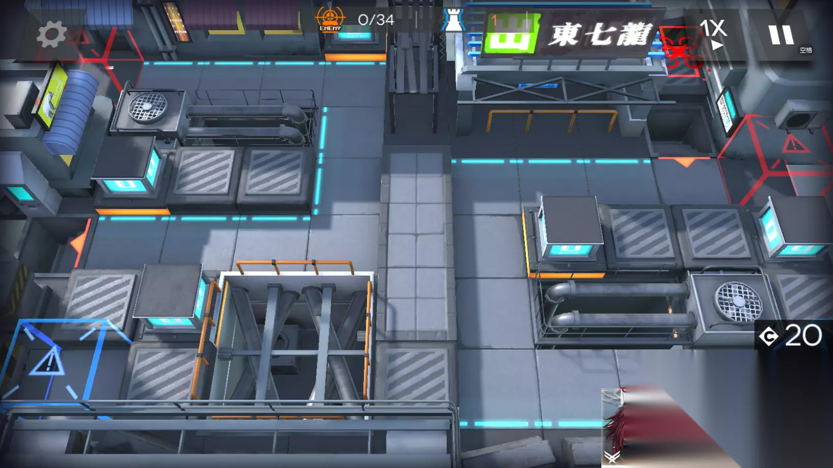 开局后先放下能天使在下图的位置,接着放下极境和古米,这里能天使必须最先放下否则会吃到敌人的仇恨。极境和古米的部署顺序则可以变化,放下后等待干员技能转好即可。注意将技能留着处理第一波敌人的强势进攻。