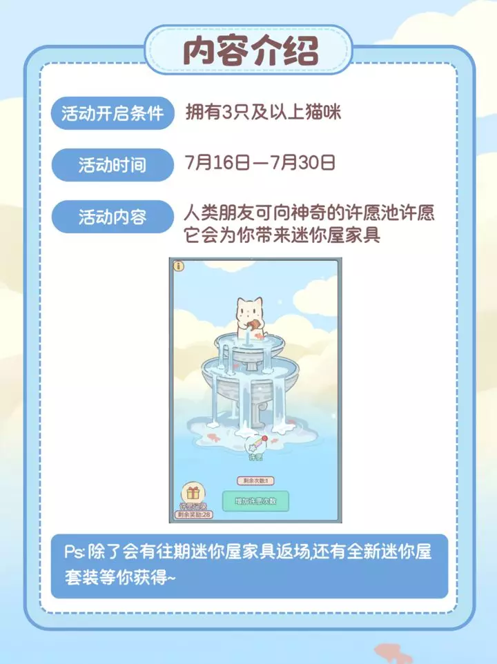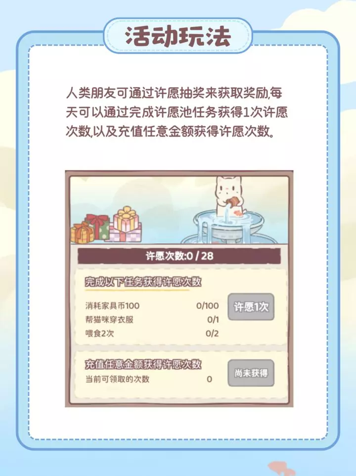 人类朋友可以向许愿池许愿,有机会获得迷你屋家具喵~