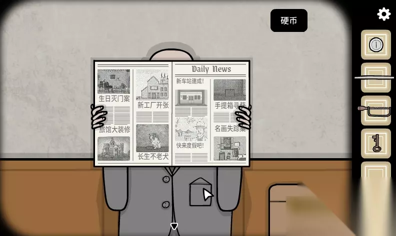 7、来到猫头鹰雕像场景,把报纸给男士,将对应图片与标题移动到一起,从他右侧口袋中拿到硬币。