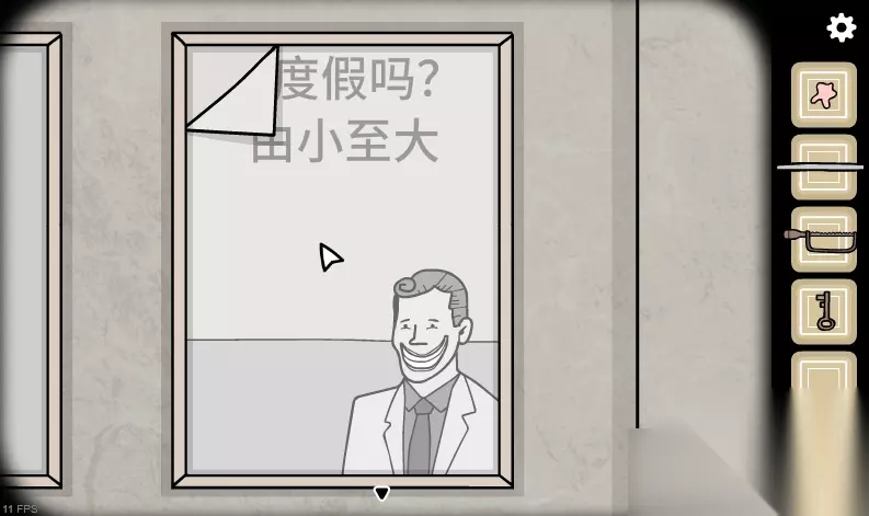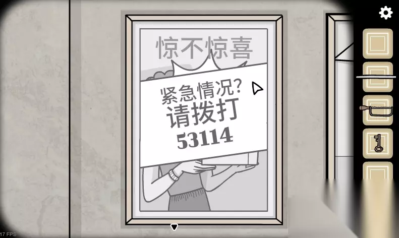 3、来到猫头鹰雕像处,捡起左下角的海报,回到两幅海报处,把捡到的画报放进左边的空相框,把嚼过的口香糖粘在下面,下拉海报粘住口香糖。根据文字提示依次点击嘴巴-眼睛-手镯-头发-眼睛-嘴巴-盒子,得到数字53114。