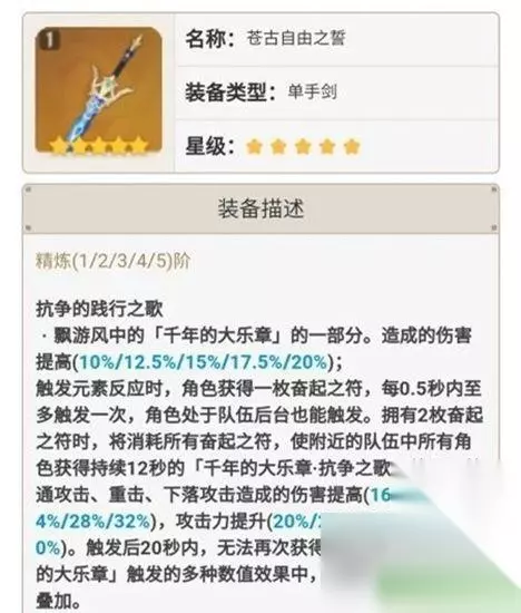 三、原神枫原万叶武器推荐: 1、万叶的主要思路还是提高元素精通,提高扩散伤害。值得一提的是,祭礼剑的表现非常出色,多一个E代表多了2次扩散,这个伤害提升其实是很大的。而且彻底解决充能问题,不抽苍古就直接祭礼好了。铁蜂刺虽然是主词条精通,但其实万叶本身精通已经很高了,再来个武器主词条精通提升其实有限,伤害方面其实祭礼要高于铁蜂刺的。 2、五星:苍古自由之誓>磐岩结绿>天空之刃 3、四星:祭礼剑>铁蜂刺>暗巷闪光 苍古自由之誓 万叶在当前版本的最优推荐武器,副属性提供高额的元素精通为万叶提供更强的辅助能力。而大乐章效果的生效条件对万叶来说也是相当简单,EA连招配合固有天赋1即可直接触发增益效果。