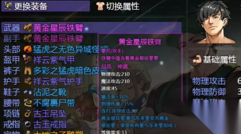 接下来说说武器部分,拳套角色的核心装备之一——黄金星辰铁臂。这把武器可是12层通关奖励,专为拳套角色打造。它不仅能够大幅提升角色的输出,而且技能效果加成也相当不赖。拿到它,你就能快速开启你的输出盛宴,打击敌人时的痛快感不言而喻。
