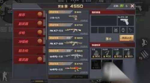 具体价格: 1.副武器价格:Glock–18 200金、USP 200金、左轮–青花瓷300金、毛瑟–御龙500金、P228 500金、沙鹰–牡丹800金 2.步枪价格:AK47–苍龙 3100金、AK47–麒麟 3600金、M4A1–天使 3600金、M4A1–战龙 3100金、9A91–S 2300金、SCAR–狼牙 2400金、AN94–SS 2600金、QBZ95 2000金、FAMAS–S 2250金、M16 2250金 3.冲锋枪价格:MP5–A 1250金、MK5–T 1700金、汤姆逊 1200金、斯太尔–S 2350、UZI–处女座 1400金 4.狙击枪:AWM–情缘 4750金、巴雷特 4750金、巴雷特–雷神 5250金、瓦尔特WR2000 5000金 5.重武器:XM1014–火焰 1400金、M38–恶棍 1800金、银月气锤 2000金、RPK–茉莉 3400金、MG3–银色杀手 3100金、M249–S 3500金 6.投掷武器:手雷 300金、燃烧弹 400金、闪光弹 200金、烟雾弹 300金 7.道具:防弹衣 650金、防弹衣 350金、工具钳 300金 其中投掷武器防具工具钳可以快捷购买。 胜利奖励:通过杀敌、埋包、获胜等获得赏金,当然失败也会获得相应的赏金。 具体金额:对局胜利 3250金、手枪杀敌 300金、步枪杀敌 300金、近身杀敌 1500金、狙击枪杀敌 150金、冲锋枪杀敌 500金、散弹枪杀敌 600金、机枪杀敌 500金、手雷炸死300金、潜伏者安放C4 800金、亲自安放C4 800+300、保卫者拆包 3500、亲自解包 3500+300