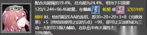 推荐角色 【艾丝妲】 配合充能绳的19.4%,总充能为24.4%,相当于只需要120/1.244≈96.46能量,在佩戴轮契或记忆中的模样时,恰好满足EAA的连招,即30+20+20+3×8(光锥效果)+5(终结技使用之后的5点)=99,即可让艾丝妲成为三动一大的T0.5强力辅助,在队伍中有火属性C位时还能提供10%增伤。