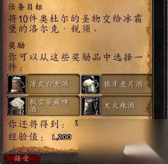 任务让你交10个【奥杜尔的圣物】,奖励是各种酒,随便选: