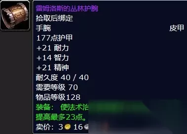 【魔兽怀旧服毒蛇神殿掉落列表】【魔兽怀旧服鱼斯拉掉落物品列表】 :皮甲 :史诗 :拾取后绑定 :手腕 177点护甲 +21耐力 +14智力 +21精神 耐久度:40/40 需要等级:70 物品等级:128 装备:使法术治疗提高最多68点,法术伤害提高最多23点。 :毒蛇神殿副本BOSS鱼斯拉(7.7%掉落率)。