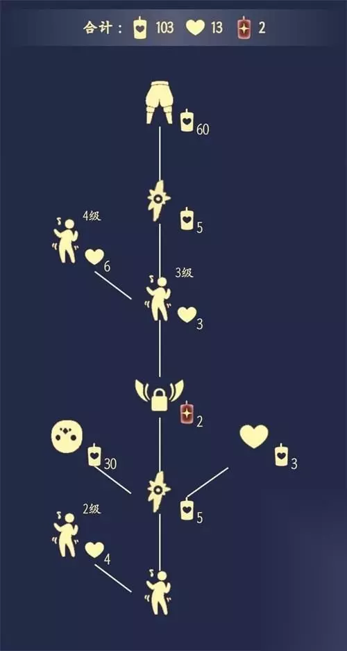 光遇白棉裤兑换图 一、白棉裤先祖 1、白棉裤-兑换需要60根白蜡烛; 2、面具-兑换需要30根白蜡烛; 3、蹦迪动作-升级需要13颗爱心; 4、兑换解锁:解锁节点需要2根升华蜡烛。 5、兑换合集需要103白蜡烛,13颗爱心,2根升华蜡烛。