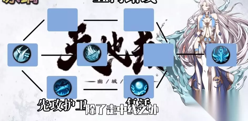 【五内加点】 主点中路,副点下路。 1、冰璃除了走中路以外,先点下路的先攻护卫技能; 2、然后和中路回合点到复活被动,这个非常强力,游戏免死技能,必点。