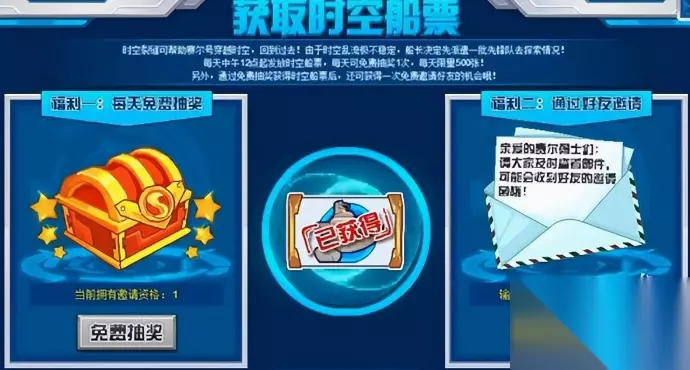 (1)每天中午12点起发放时空船票,每天可免费抽奖1次,每天限量500张。 (2)另外,通过免费抽奖获得时空船票后,还可获得一次免费邀请好友的机会。