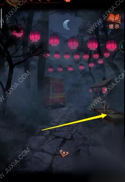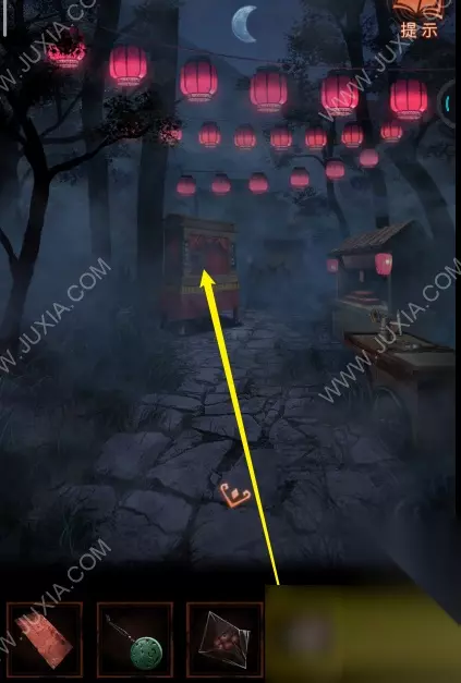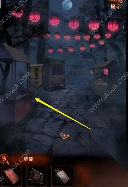 29.来到最左边场景,点击白衣服纸人手中的铜锣,使用锣棒敲锣两下进入一更。29