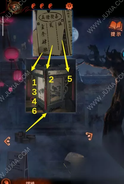 31.返回中间场景,查看凳子上的灯笼,对照报纸上的数字拉动灯笼上的灯穗如图31,获得剪刀纸元宝。31