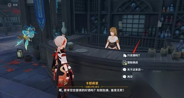 5、在那里,你会遇见NPC卡琵莉亚。与她对话时,选择“只卖酒吗?”选项,进入卡琵莉亚的商店。