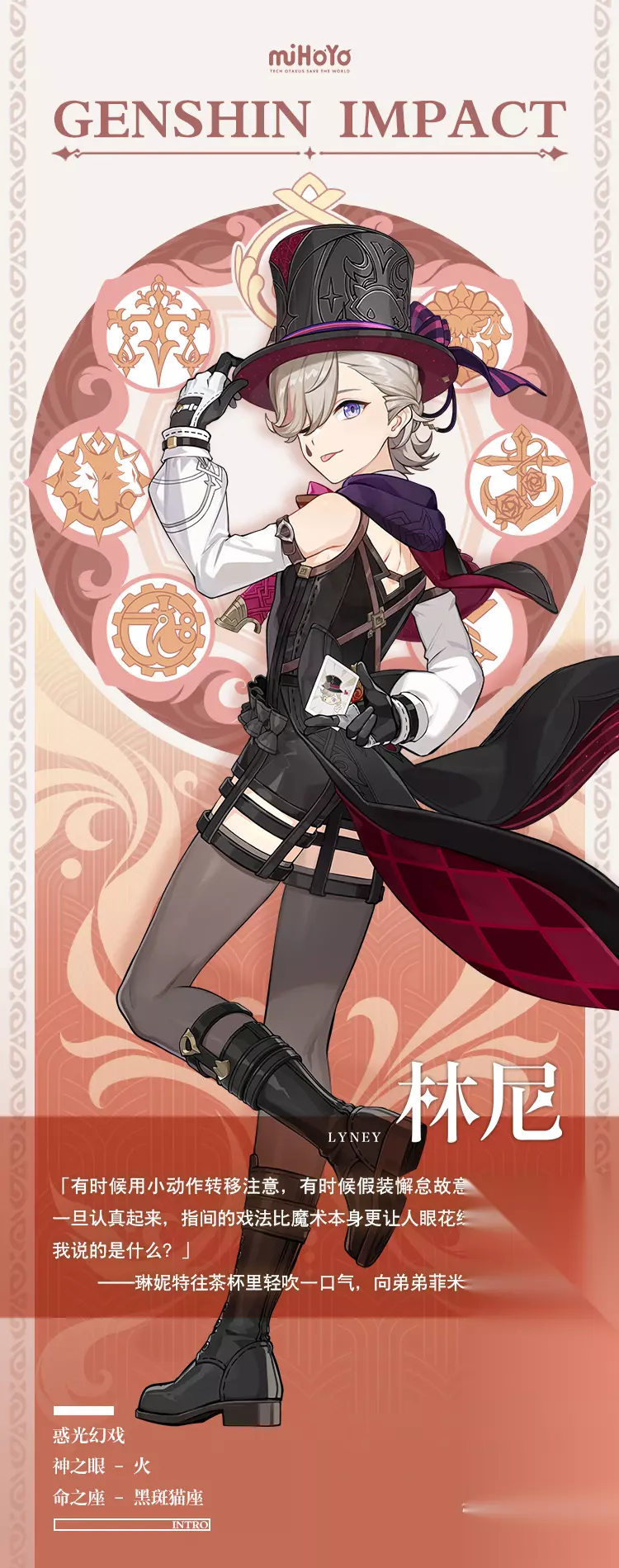 原神当中的林尼这个角色是琳妮特的哥哥,在游戏当中是一位伟大的魔术师,林尼在进行魔术演出的时候散发出无穷的魅力,舞台上的林尼夺目璀璨,十分的吸引人,他们的魔术表演是枫丹廷最好的魔术表演。