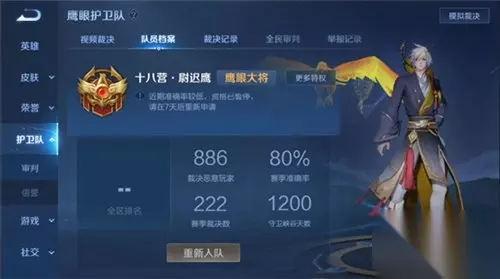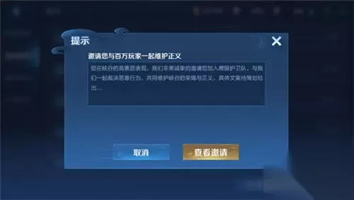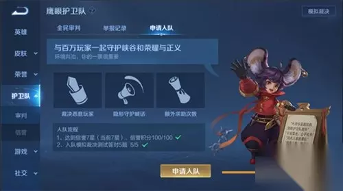 目前护卫队全民审判社区功能正在灰度中,我们从全服中随机抽取了5%的玩家,以及之前参与了“鹰帅点将”招募活动的玩家进行灰度测试。 灰度测试将采取官方邮件邀请的形式,除此之外没有其他方式,请勿相信任何渠道的邀请广告。 待功能稳定后将逐渐开放给更多的玩家,各位召唤师敬请留意官网公告。 入队流程 那么如何才能成为一名光荣的鹰眼护卫队队员,可以真正行使到裁决的权利呢? 入队条件1:信誉等级7星且信誉积分=100分 符合条件(信誉等级7星+信誉积分100分)的玩家将收到邀请邮件: