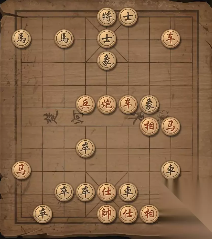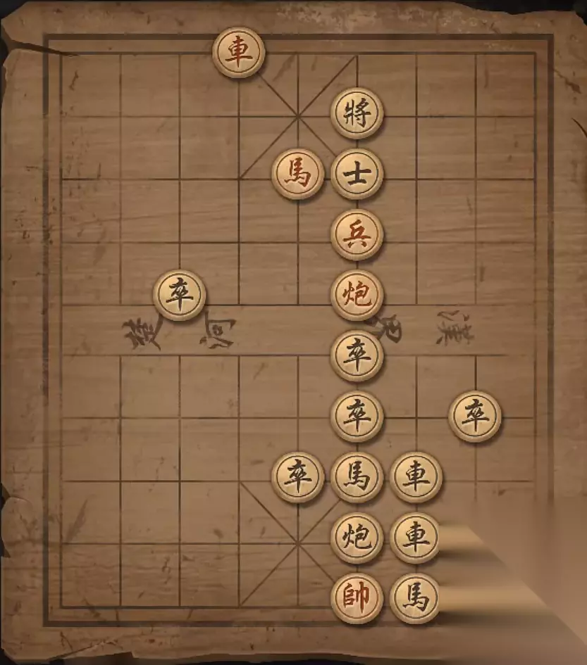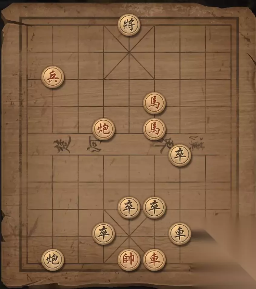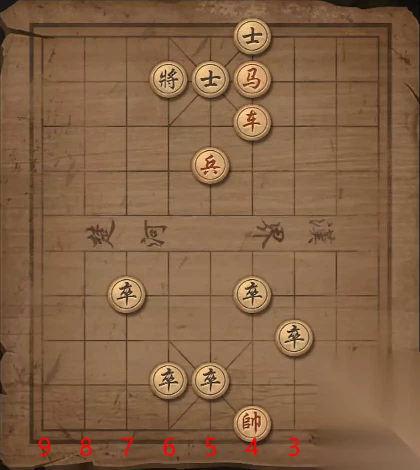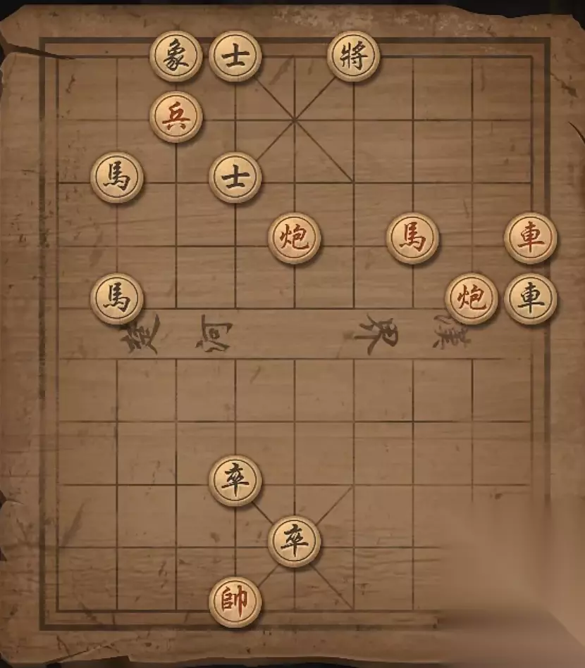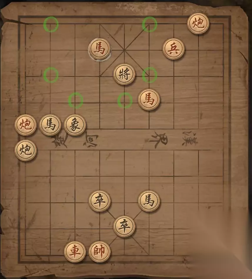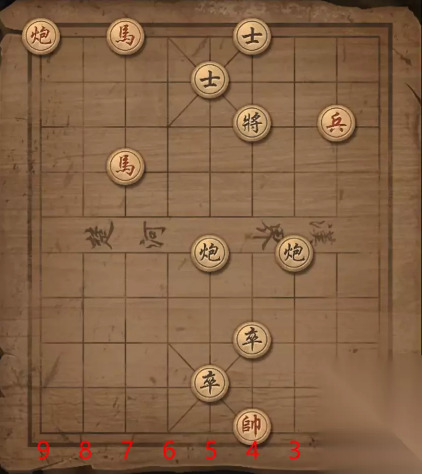 残局四:兵2平3,炮9退一格,马7退6,兵3进一格,马7退5,炮9退一格,将军。