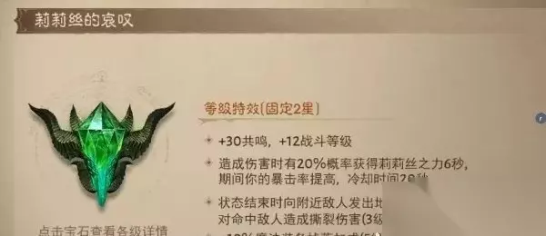 伤害类评价:★★★★★ 实用性评价:★★★★☆ 狂热之牙其实上限很高,增伤可以达到10级24%,而且打精英和首领还有6%伤害提升,缺点有4个。①是叠加需要一定时间(现在很多职业都能把这个时间压缩到很短了,基本忽略)②同时打PVP效果不理想,③死灵玩家用不了,因为不给召唤物增伤,④制作周期比较久,毕竟是只有购买先祖之路才可以获得的宝石。所以3大增伤宝石狂热之牙是排第三的,但比其他宝石还是有很大增伤上的优势。 TOP2:莉莉丝的哀叹