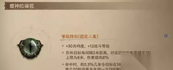 伤害类评价:★★★☆ 实用性评价:★★★ 闪电核心是所有职业都可以用的技能型增伤宝石,普攻和移动充能偏向力量职业但20秒冷却一次其实都能快速充满不用考虑。释放闪电后有3%的增伤效果,是2星技能输出类宝石里比较好用的,和力量统御一样想要增伤觉醒带个10级都可以。 TOP5:猎神的凝视