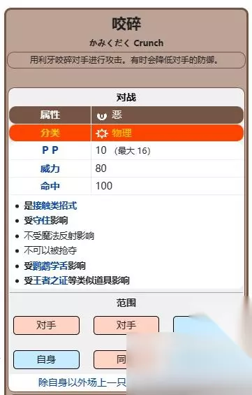 4、咬碎招式效果是用利牙咬碎对手进行攻击,威力80,有时会降低对手的防御。