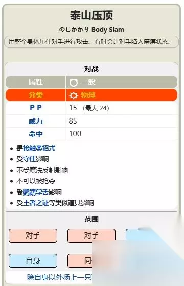 5、泰山压顶招式效果是用整个身体压住对手进行攻击,威力85,有时会让对手陷入麻痹状态。