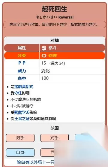 3、起死回生招式效果是竭尽全力进行攻击,自己的HP越少,招式的威力越大。