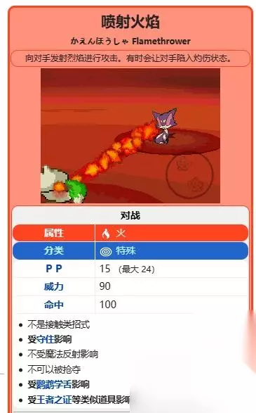 2、风速狗推荐招式搭配是【喷射火焰 起死回生 咬碎 泰山压顶】,这套招式可以大大增强风速狗的战斗能力,如下图所示,喷射火焰招式效果是向对手发射烈焰进行攻击,威力90,有时会让对手陷入灼伤状态。