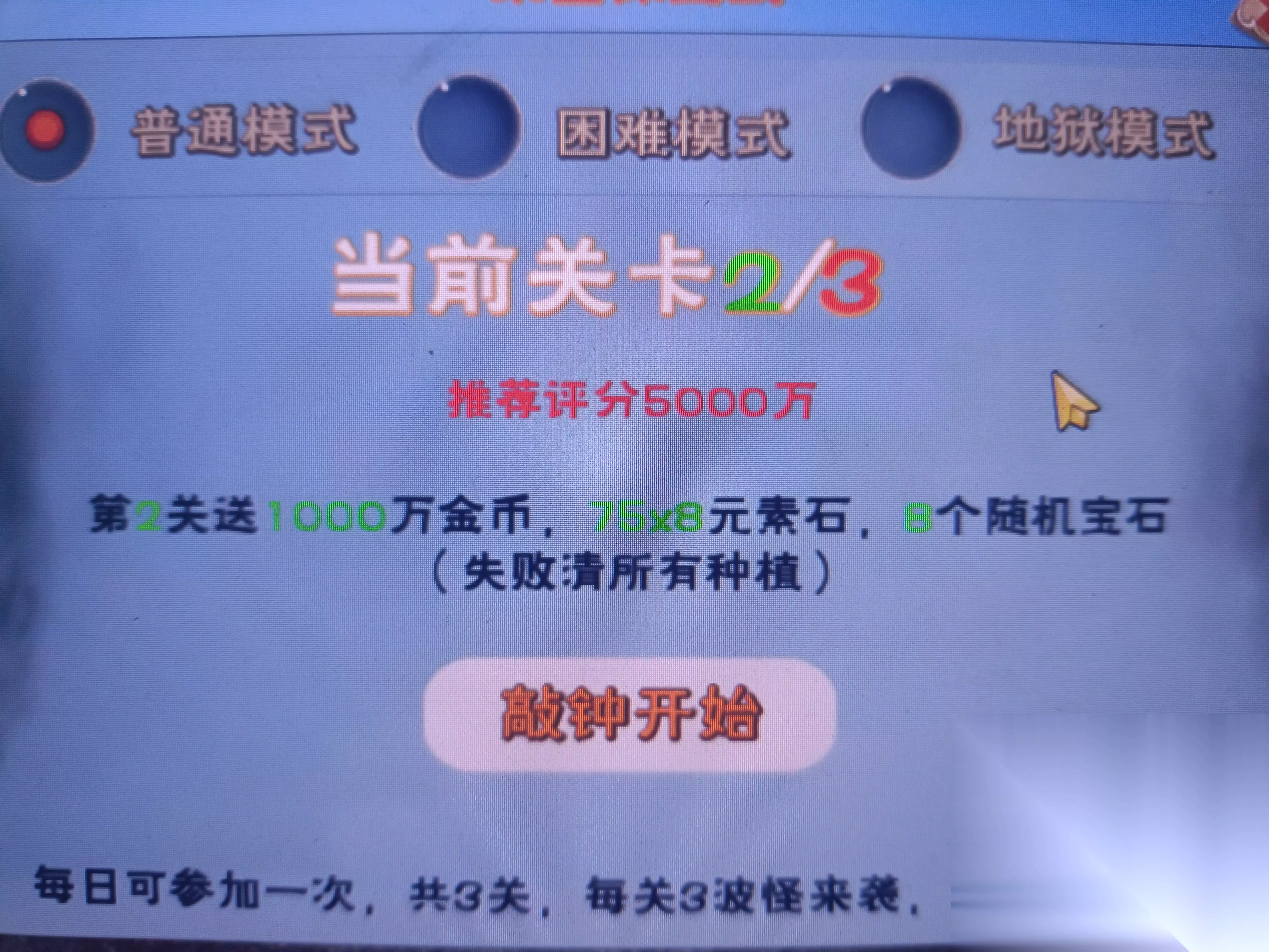 共三个模式(每个模式有3关,每关有3波怪): 一、普通模式: 第1关: 推荐评分3000万;奖励500万金币,50x8元素石,4个随机宝石。 第2关: 推荐评分5000万;奖励1000万金币,75x8元素石,8个随机宝石。失败清所有种植。 第3关: 推荐评分7000万;奖励1500万金币,100x8元素石,16个随机宝石,送1元累充加30元宝。失败清所有种植并污染1块地。 二、困难模式: 第1关: 推荐评分7000万;奖励1000万金币,50x8元素石,8个随机宝石。 第2关: 推荐评分9000万;奖励1500万金币,75x8元素石,16个随机宝石。失败清所有种植并污染1块地。 第3关: 推荐评分11000万;奖励2000万金币,100x8元素石,32个随机宝石,送1元累充加30元宝。失败清所有种植并污染2块地。 三、地狱模式: 第1关: 推荐评分11000万;奖励1500万金币,50x8元素石,16个随机宝石。失败清所有种植并污染1块地。 第2关: 推荐评分13000万;奖励2000万金币,100x8元素石,32个随机宝石。失败清所有种植并污染2块地。 第3关: 推荐评分15000万;奖励2500万金币,200x8元素石,64个随机宝石,送1元累充加30元宝。失败清所有种植并污染3块地。