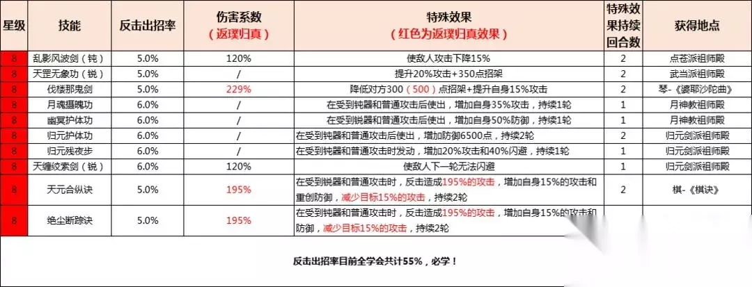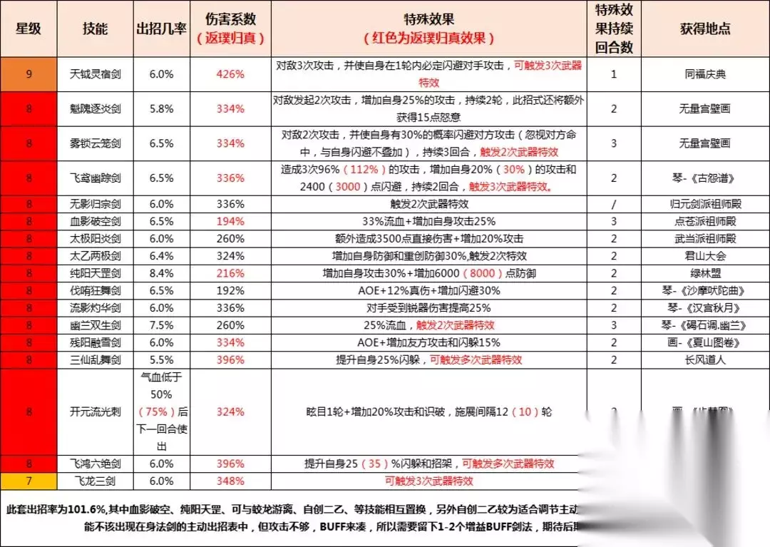 感谢“计然”大侠分享 一、序言篇: 大家好,依旧是我,笙歌醉里-计然,数月前给各位分享了剑道的提升指南,算是个启蒙贴,随着官方的更新迭代,剑修玩家们在各版本的更新中,翘首期盼加强,然而却步履蹒跚地前进,我很欣慰地看到还有很多执着于此,且热爱剑修职业的玩家,那接下来就给各位分享一下进阶的玩法。 在各位步入七星堡后,便开启了新的篇章《江湖风云录》系列,此系列目前难度较大,新手玩家可查阅我之前的攻略(虽过期,但也可借鉴,到七星堡不成问题)。 言归正传,攻略开始。 二、设问篇: 1、Q:重剑和身法剑的选择? A:七星堡之前,重剑以较大优势领先身法剑、因身法剑成型异常慢,自身属性要求极高,故七星堡之前本人推崇重剑玩法; 2、Q:转职身法剑的要求是什么? A:目前经多方成型的小伙伴测试,需身法>1W+为最基础要求,此时的身法剑仍略逊于筚路蓝缕而来的重剑,当身法>1.2W+时,身法剑闪避优势开始彰显,且新版本中闪避后可反击,算是将身法剑拉回了正轨,此时的身法剑为初步成型,可将游龙心法良好发挥; 3、Q:为什么选择身法剑? A:心法《游龙惊鸿》,听着就 飘逸帅气,机制闪避=莫挨老子!还为了百晓生的那一句戏言“天下第一身法剑”, 更重要的是,后期的发展趋势,鄙人从策划对剑修职业的定位来看,会闪避的身法剑才是剑修职业后期的主流定位。 三、技能篇: 1、主动剑法(身法剑)推荐: