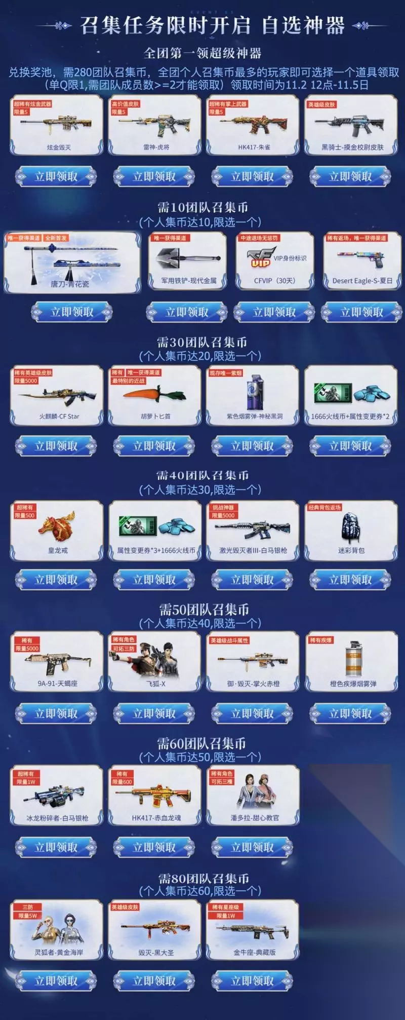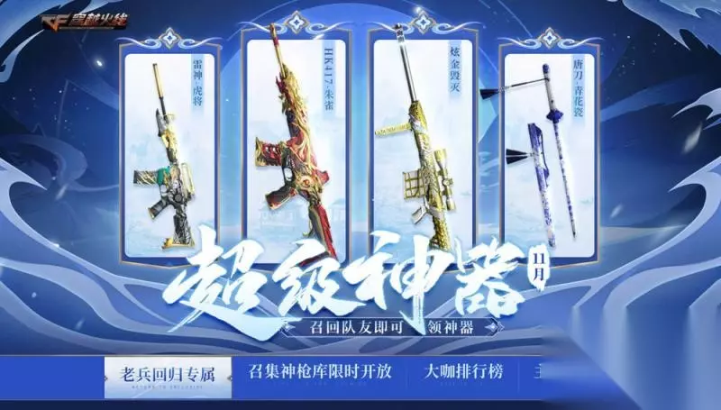 1、邀请好友获得召唤币并兑换以下奖励:黑骑士-魔金队长皮肤、唐刀-青花瓷、CFVIP、胡萝卜匕首、紫色烟雾弹、神秘黑洞、迷彩背包、飞狐-X、潘多拉-甜心导师等等。