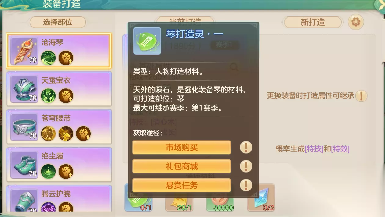 *所有打造结果均可储存到【打造仓库】随时调用。 三、材料获取与优化系统 打造需消耗装备打造灵(悬赏任务/银票市场获取,各等级通用)与打造符(摊位交易/活力兑换)。