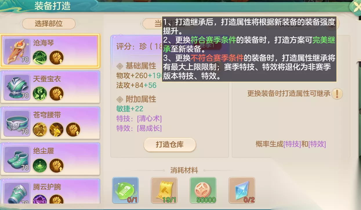 若新装备符合赛季条件,则打造方案可完整继承;若不符合赛季条件,继承属性将受装备强度上限限制(例如80级强度属性继承至90级装备仍按80级生效),同时赛季特技/特效将退化为普通版本(如【易成长·赛】退化为【易成长】)。