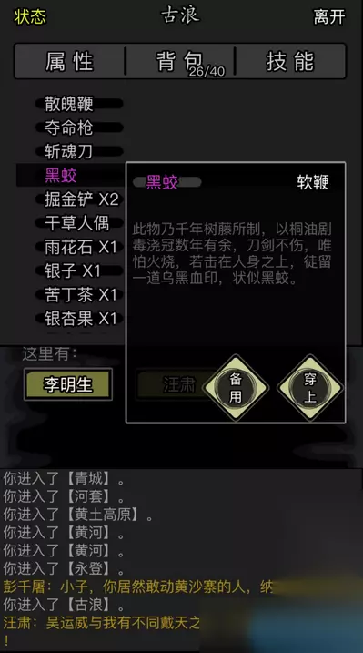 战斗机制与环境探索的精妙设计: 动态成长的敌人: 别以为能轻松碾压!敌人强度会狡猾地根据你的转生次数动态调整,确保挑战常在。战斗核心永远是精准闪避敌人关键技能以及运用连招有效打断敌方攻势。 场景中的秘密: 任务区域(尤其古浪附近)并非只有打打杀杀。留心观察!那棵沧桑的银杏古树、那辆倾覆的废弃镖车...上前与之互动,虽非任务强制要求,却能收获意外材料奖励,不拿白不拿! 无声的叙事: 整个任务没有冗长的强制剧情动画打断你的江湖节奏!荆无悔的过往、他的愤怒与坚持,都巧妙地通过场景细节、敌人配置以及他与你对话时流露的情绪逐步呈现,沉浸感十足。 后续价值与实用技巧: 可重复拜访的NPC: 任务完成后,荆无悔会常驻古浪特定位置。后续可向他提交某些特定材料兑换基础资源包,但说实话,性价比通常不如专注刷副本。 奖励武器"黑蛟"解析: 这是任务核心奖励,一把优质的过渡型长鞭。其附加的"破甲"效果尤为可贵,能显著强化某些依赖破防的门派武学(鞭法类技能尤甚),助你轻松应对中前期挑战。 任务重置机制: 若首次尝试未能完成,别担心。系统约三天(游戏内时间)后会自动重置任务状态。但请注意,重置后吴青烈那场战斗的难度会小幅提升! 跨任务资源规划: 江湖任务环环相扣!任务中涉及的部分物品(特别是与场景探索相关的),在后续第八章"青城山银杏古树"任务中还能复用!合理安排任务顺序,能省下宝贵的资源消耗。 荆无悔的江湖,是刀光剑影下的恩怨分明,也是夜深人静时的低语诉说。把握关键触发点,巧妙应对分支选择,洞察环境中的隐秘叙事,方能在这场精心设计的互动中收获稀有珍宝,更触摸到一段生动的江湖往事。拔剑启程,古浪的风已在呼唤你的名字!