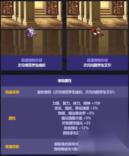 3、称号 两个称号,分别是星之记忆魔法书和少年之记忆魔法书。 4、宝珠 今年特别的是宝珠,鞋子和腰带宝珠都提升至增加5%技能攻击力。 5、宠物 2选1宠物,名望+752、四维+150、攻击强化+12%、属强+25。