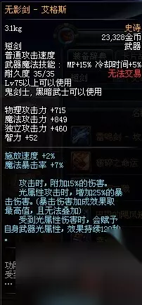 DNF的无影剑可以被视为游戏的一个标志性元素,对于玩这款游戏的朋友们来说,无影剑是众所周知的。它可以被视为鬼剑所有职业的终极武器,但在大转移后将不再存在,不过新的无影剑也将随之出现。让我们来看看这两款无影剑的属性对比。 DNF无影剑艾雷诺: 1、攻击时,能附加30%的额外伤害,这使得它在刷图时非常有用。(已在PK场被平衡) 2、由于剑身不可见,有时可能难以掌握攻击的准确距离。这把武器有其优点也有缺点,但正是这种无剑身的特性,使它独一无二。 3、对于主要依靠固定伤害的剑士职业(如狂战士、阿修罗等)来说,这把武器非常适用,伤害极高。此外,女鬼剑以及剑魂、鬼泣使用它也同样效果显著。 4、在85版本中,它唯一的缺点是基础属性过低。 主要的方法有三种: 1、深渊掉落:55级~ 63级深渊地下城怪物掉落。(只有非常困难才会掉落) 2、七彩迷雾袖珍罐有一定概率获得(开启需费用1500万游戏币) 3、金色迷雾袖珍罐有一定概率获得 (开启需费用30万游戏币) 推荐爆点:绿都格罗兹尼、斯卡萨之巢、根特南门、悲鸣洞穴、根特外围、王的遗迹。 大转移之后将不再产出 DNF无影剑艾格斯