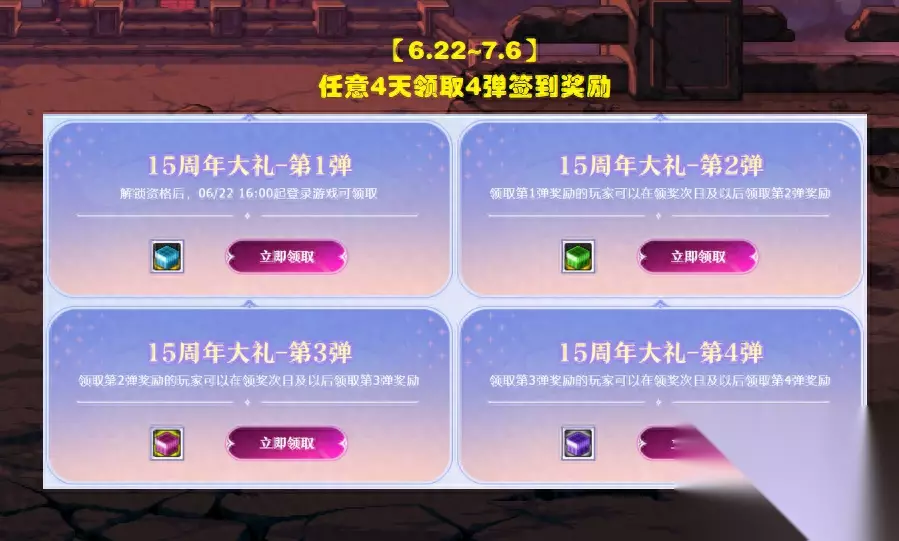 【第3个时间点】:6.22~7.6,可以上线! 这个时间段就是周年庆的重磅奖励放送了,从时间上来看其实非常宽松,十多天中任意抽取4天上线游戏,就能领取4弹奖励。 需要注意的地方有:(1)从6.22开始领取4弹签到奖励,每天只能领取1弹,需要分4天领取,这4天并不需要连续签到;