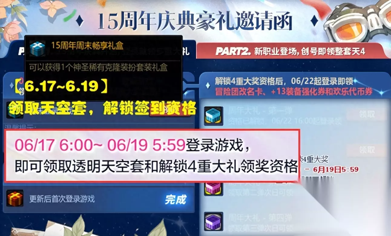 6.15更新之后,一年一度的周年庆终于上线了,不过有玩家上线后表示很懵逼,说好的天空套、13强化券怎么不能领呢?这里咱们就来总览一下整个周年庆的活动流程,最需要注意的是3个时间节点! 周年庆活动流程一览 【第1个时间点】:6.15~6.17,尽量上线! 这是周年庆更新后的第一个内容,大家上线后可以领取的是:15周年庆光环、全身史诗、以及一键转移券。