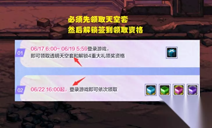 6.17~6.19,上线领取天空套,同时解锁签到奖励资格,这是必须上线的时间段! 6.19~7.6,这就属于领取4弹签到奖励的时间了,不需要连续上线,大家随便找4天时间上线即可。 除了上面比较重要的时间节点外,还有一个小时间点大家也可以注意一下,6.25将会是首批领取代币券的时间点,届时大量玩家都会开魔盒,各种拍卖行道具疯狂降价,一年一度薅羊毛机会可以争取一下。