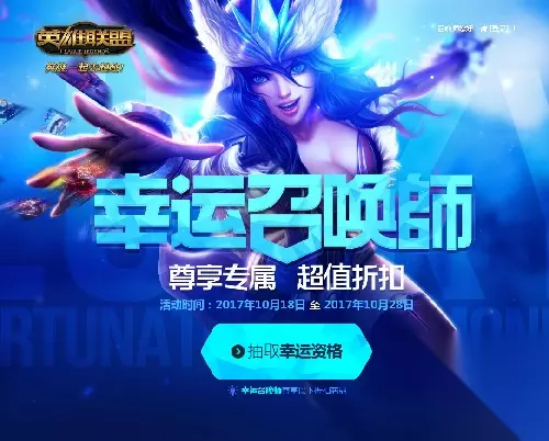 活动规则: 1、在活动期间,幸运召唤师可以在页面选购道具,每类道具仅限购买一个,仅限本人购买。 2、活动时间一般是10天,本次幸运召唤师活动时间是:10月18日—10月28日。 小编提醒: 这是一个完全看运气的活动,运气好的玩家可以抽到幸运召唤师资格,以1折优惠购买英雄、皮肤以及加成道具。 注意事项: 1.需要获得幸运召唤师的资格才可以购买。 2.英雄皮肤道具只能购买一次,请谨慎选择想要那个。 3.点击“抽取幸运资格”才能知道自己中没中奖。