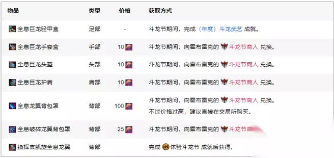 目前版本的部件包括【全息巨龙头盔】【全息巨龙护肩】【全息巨龙手套】与【全息巨龙胫甲】 其他部件需要在未来的斗龙节活动中继续解锁,本年度解锁的部件是最新的【全息巨龙胫甲】