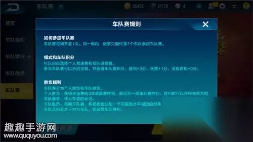 QQ飞车手游中,加入车队后会多一个车队赛的玩法,参加车队赛不仅能提高自己的实力,还能体现这个车队的队友实力,并且赢得比赛还能获得不错的奖励,还不知道车队赛怎么玩的玩家,跟小编一起来看看车队赛的详细介绍吧。 车队赛规则 车队赛每周开放一次,为了防止一些比较厉害的玩家参加完这个车队的车队赛,然后退出车队去参加另外一个车队的车队赛,所以特别规定,每个角色每周只能代表一个车队参与车队赛,杜绝了代刷分的现象。除此之外,为了保证车队赛的公平性,每期车队赛,匹配到的对手都会是同服里面水平相近的车队。
