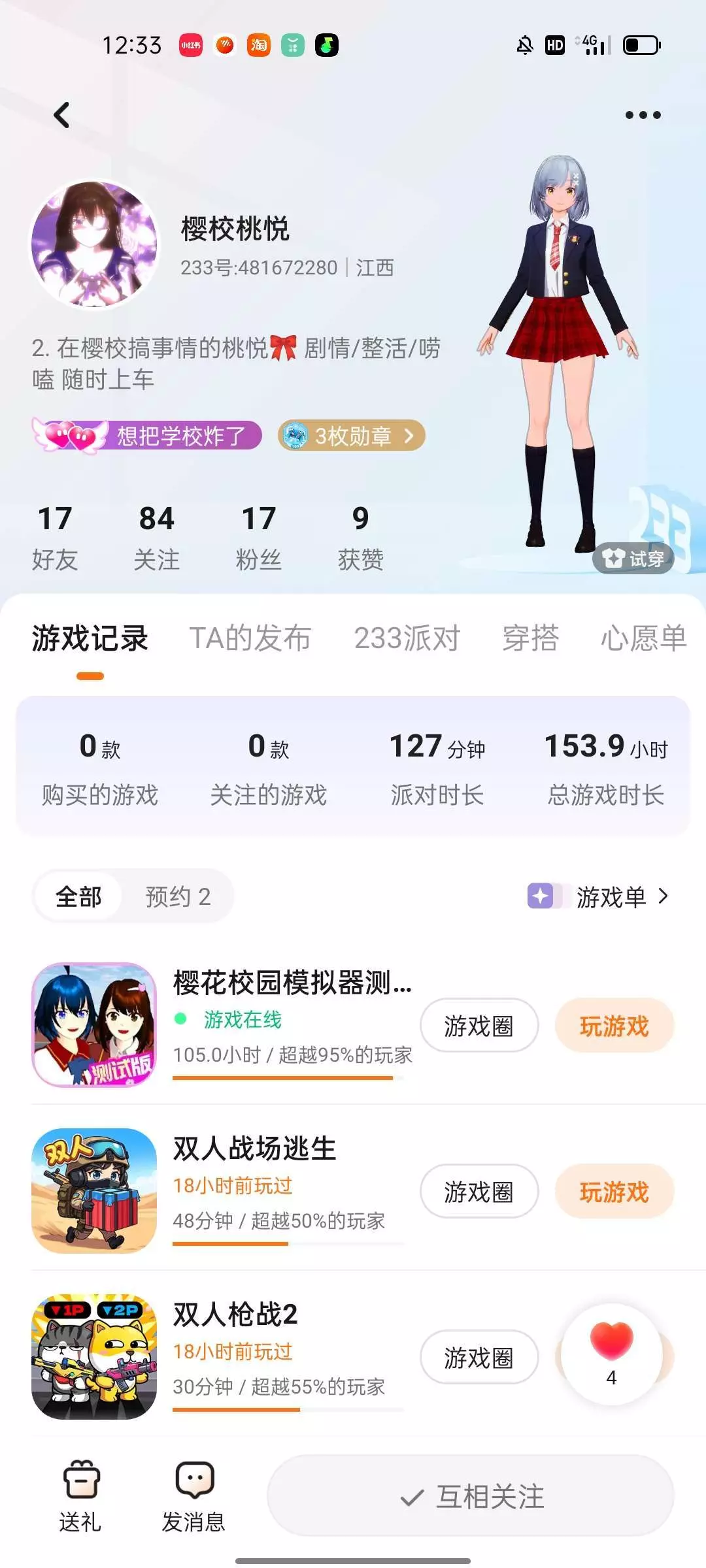 这是我在233乐园遇到最好的人,我和她出闺了(✪▽✪)我俩都是樱花校园的,以后呢,只交友不出闺哈,因为有闺了