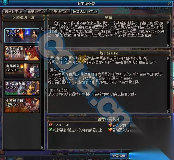 DNF2017领主之塔介绍: 推荐等级:50-90级 进入次数:2次 推荐装备:适应LV的稀有武器以上 冒险团入场次数:8次 剧情: 塔内一片寂静,看不到丝毫人影犹如一个战后的废墟。只有墙上斑驳的痕迹在向你诉说,这里曾经发生过累累战役。多少英勇的冒险家倒在了这里,而战胜他们的却是那些死去的宿敌……已经有多久没人踏入这里,而如今,塔内又亮起了微弱的火把那昏黄的火光忽明忽暗,似乎在向你发出沉默的邀请... 地下城介绍: 周常地下城是指在每周的特定星期开放的特殊地下城。 在周常地下城中可以获得特殊的奖励,有助于角色的快速成长和装备成型. 进入方法 可以在每周五和周日通过赛丽亚房间里的吟荷NPC进入。单个角色每日可以进入2次,初始状态下,单个账号每日最多可以进入5个角色。 DNF2017领主之塔改版奖励 消灭怪物可以获得特殊材料,可在吟荷HFC的商店换取奖励
