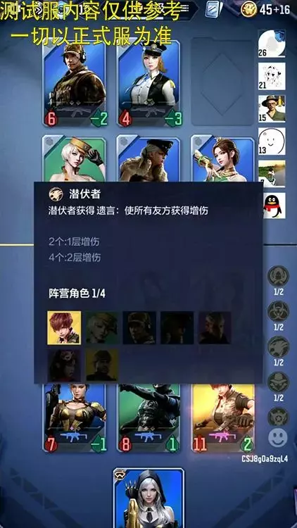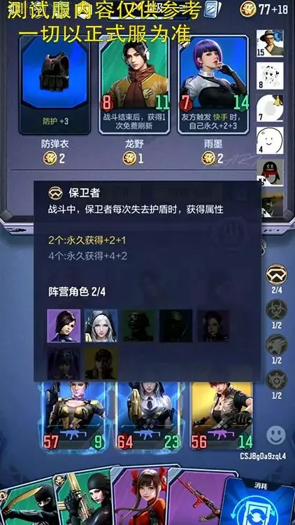 在前期都是低阶牌的时候,保卫者的数值加成似乎有些优势,因此可以选择保卫者4潜伏者2的方式上阵角色。但中后期牌手双方的牌数值都会非常夸张,保卫者数值加成明显不适合。如果能换就换其它阵营上场,如果不能,就采用潜伏者4保卫者2的方式,潜伏者的增伤显然会有更大收益。