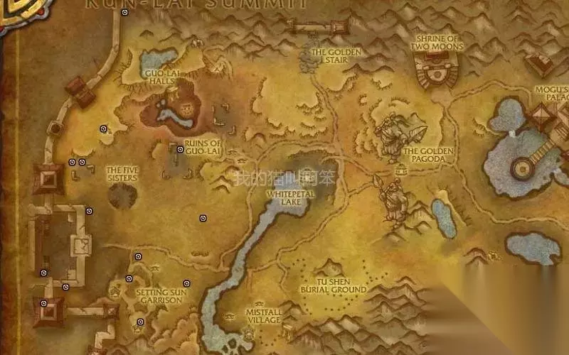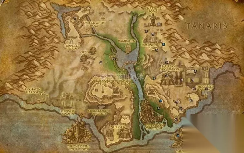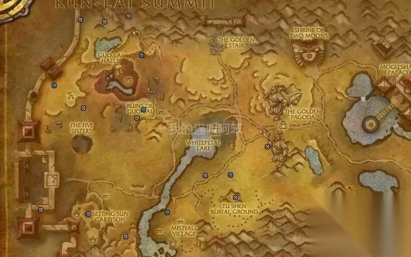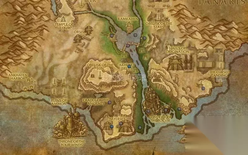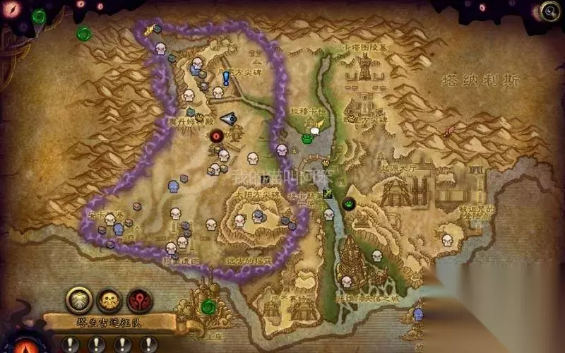 左上亚吉其莱勋爵,坐标34.5,19,掉落宠物腐息。它在月亮方尖碑下的月亮密室里。 中间食尸者,坐标31,50,掉落坐骑恶毒工蜂。 左下斯克提拉兹,坐标21,61.5,掉落宠物亚基地道虫。 右下四风之龙艾夏克,坐标74,83,掉落坐骑四风幼龙。 四风之龙艾夏克是每个突袭都会刷的稀有怪,它刷出来后会绕着平台飞行,现在集合石上蹲它的团挺多的。后面的图里也有它,就不再重复了。