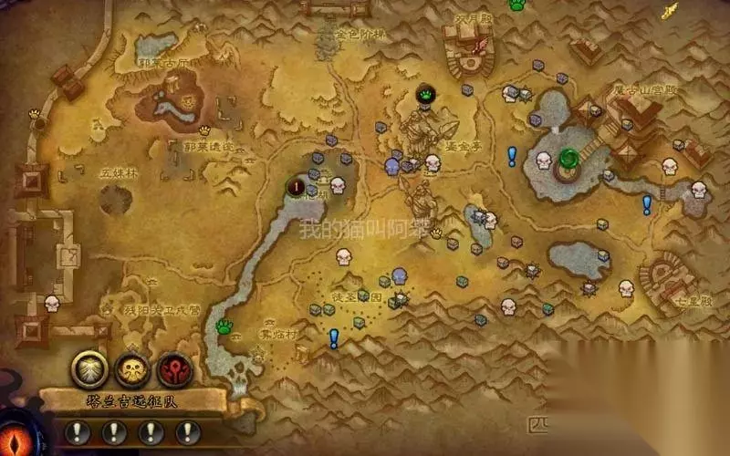 上恩佐斯的凝视,坐标55,53。掉落合成玩具全视双眼的道具全视右眼。 左下大执行官,坐标49,82。掉落玩具坚决护手。 handynotes插件还能显示地图上的宝箱和新的橙色宠物对战NPC的位置,但角色需要接到奥丹姆的威胁突显任务,且和高阶指挥官卡姆塞斯对话之后,地图上才能显示这些的图标。另外就是图上的友善的羊驼和基萨尔野菜的图标都只标了一个,还有很多位置没标出来。 锦绣谷:黑暗帝国突袭