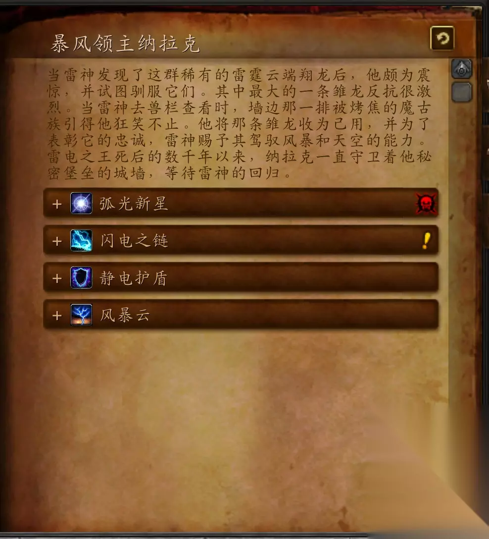 暴风领主纳拉克 当雷神发现了这群稀有的雷霆云端翔龙后,他颇为震惊,并试图驯服它们。其中最大的一条雏龙反抗很激烈。当雷神去兽栏查看时,墙边那一排被烤焦的魔古族引得他狂笑不止。他将那条雏龙收为己用,并为了表彰它的忠诚,雷神赐予其驾驭风暴和天空的能力。雷电之王死后的数千年以来,纳拉克一直守卫着他秘密堡垒的城墙,等待雷神的回归。