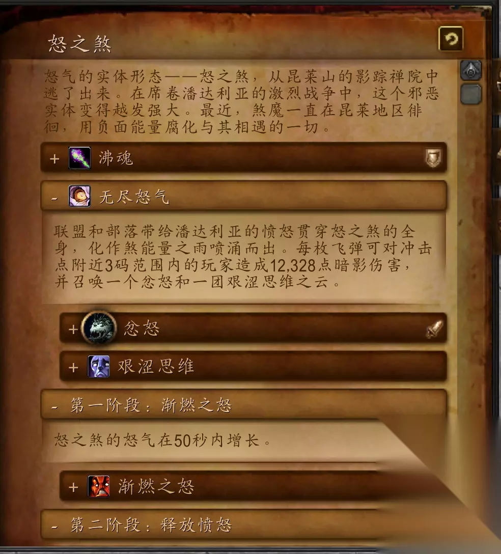 怒之煞 怒气的实体形态——怒之煞,从昆莱山的影踪禅院中逃了出来。在席卷潘达利亚的激烈战争中,这个邪恶实体变得越发强大。最近,煞魔一直在昆莱地区徘徊,用负面能量腐化与其相遇的一切。