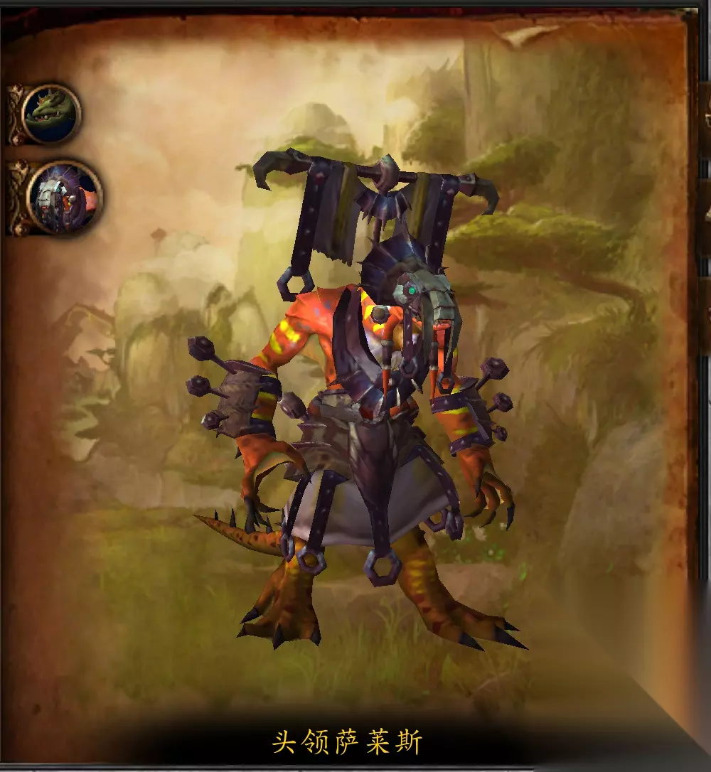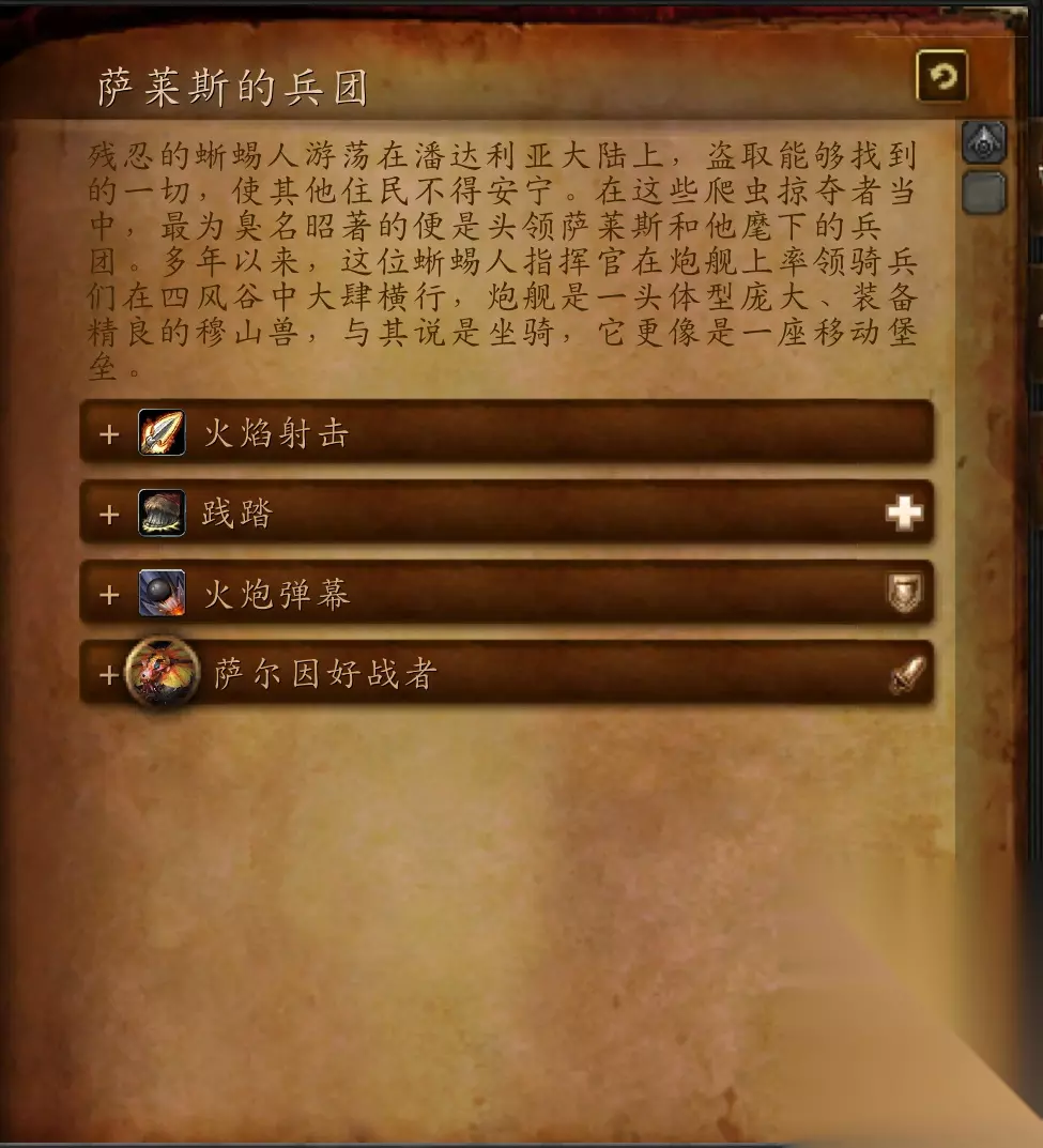 萨莱斯的兵团 残忍的蜥蜴人游荡在潘达利亚大陆上,盗取能够找到的一切,使其他住民不得安宁。在这些爬虫掠夺者当中,最为臭名昭著的便是头领萨莱斯和他麾下的兵团。多年以来,这位蜥蜴人指挥官在炮舰上率领骑兵们在四风谷中大肆横行,炮舰是一头体型庞大、装备精良的穆山兽,与其说是坐骑,它更像是一座移动堡垒。
