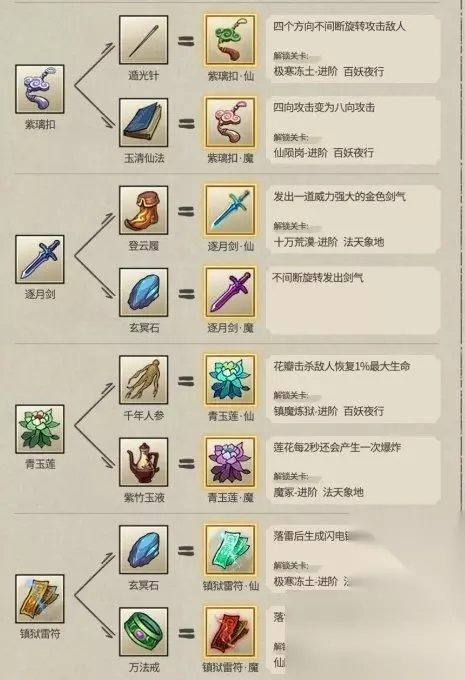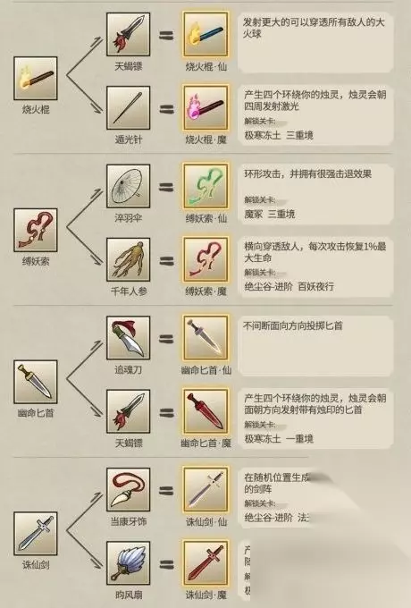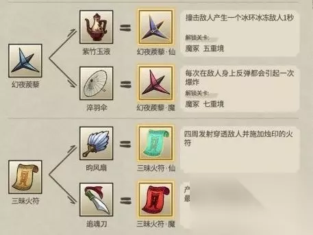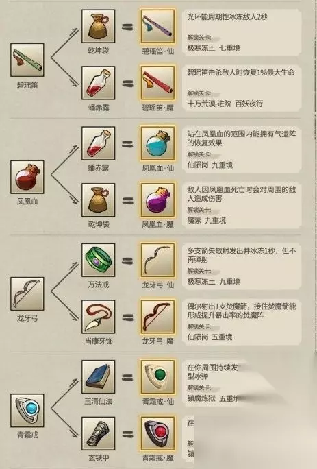 13.昆仑扇+昀风扇 14.青玉莲+紫竹玉液 15.缚妖索+千年人参 16.三味火符+追魂刀 17.幻夜蒺藜+淬羽伞 18.镇狱雷符+万法戒