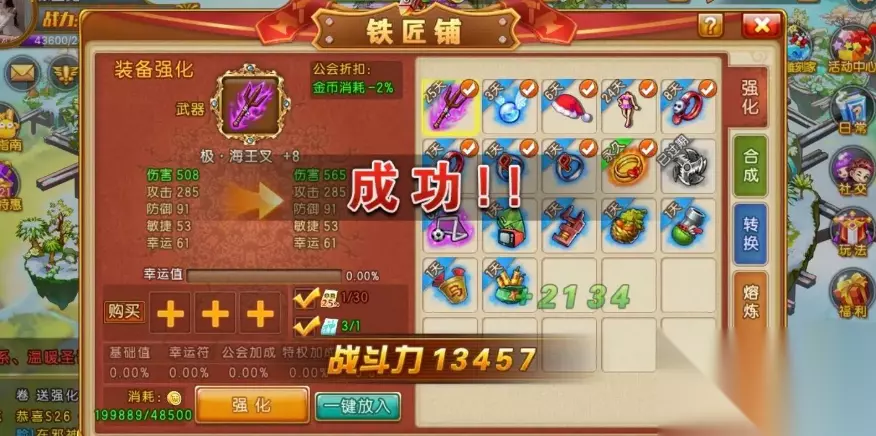 强化装备时,咱们要记住一个核心原则:均衡发展比单点突破更靠谱。所有装备部位的强化等级差最好控制在3级以内,比如武器+9时,其他部位至少+6才能继续强化。每次强化前记得准备好足够的金币和对应等级的强化石,等级越高消耗越大。铁匠铺界面左上角会显示当前装备的强化状态,建议优先用低级装备垫概率,连续失败几次后再强化目标装备,这样成功率会明显提升。