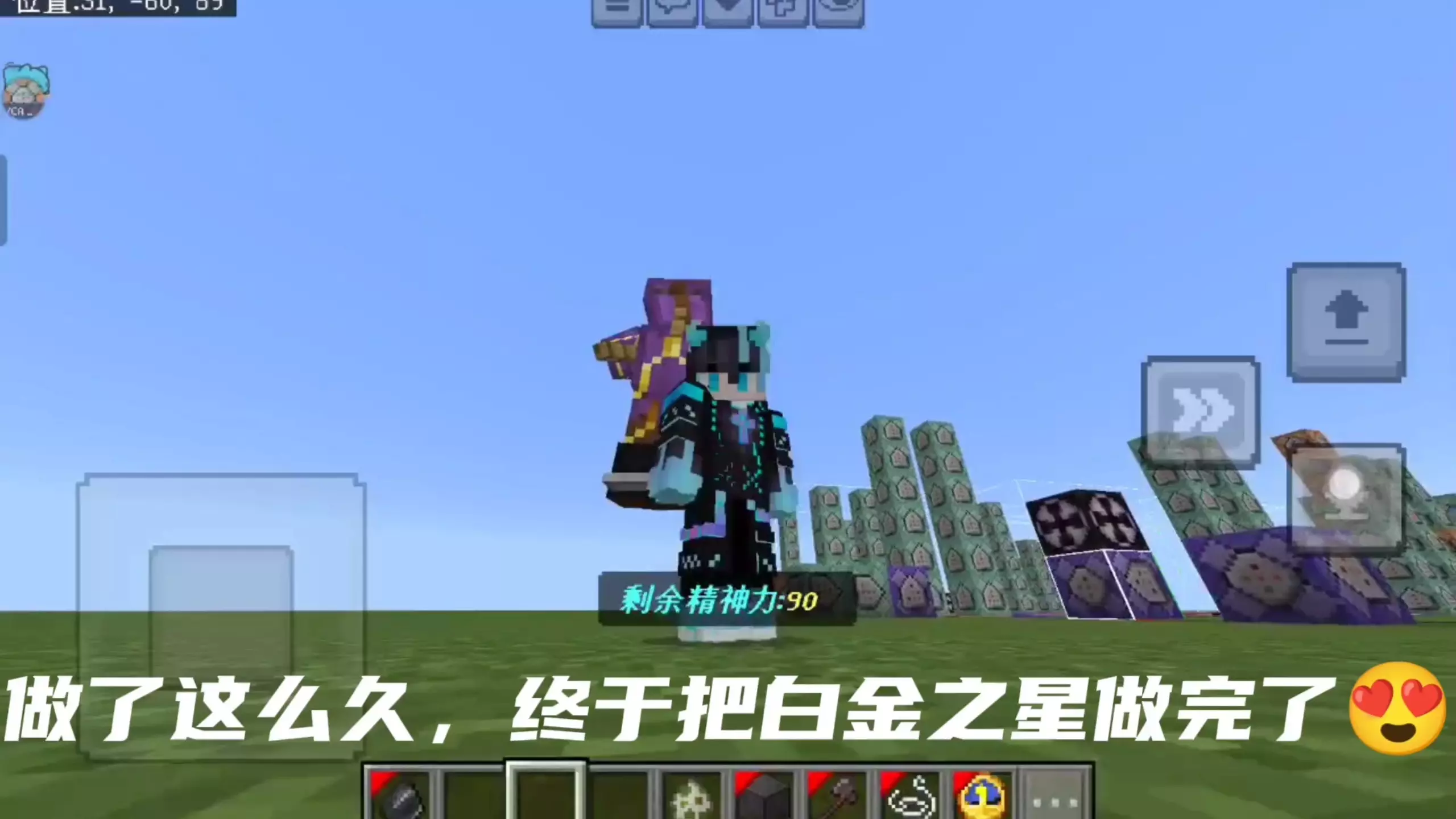 这是《我的世界基岩版》的指令替身演示,展示了以《JOJO的奇妙冒险》中空条承太郎的替身白金之星制作的MCBE指令替身,呈现了该替身的装备、召唤等相关内容,号称是全网最好的指令替身。